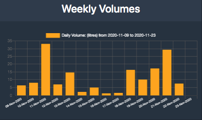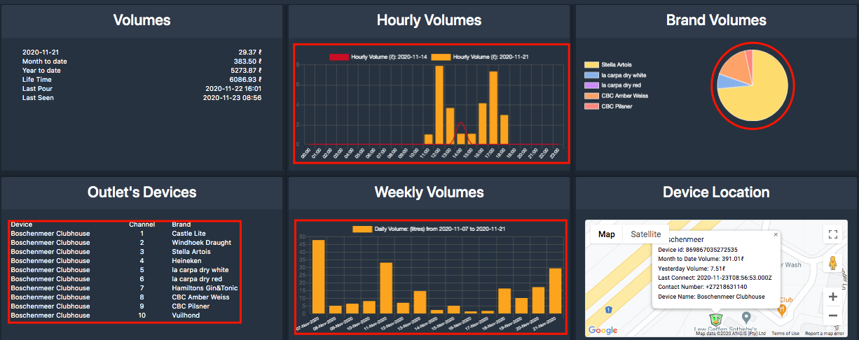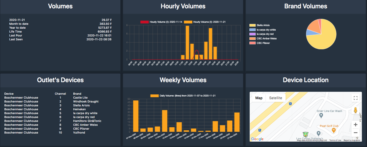 This graph shows the hourly volumes poured for the outlet (in orange). you can hover over each bar for further info. The red graph indicates the pour volumes for the same period the for the same day week before.